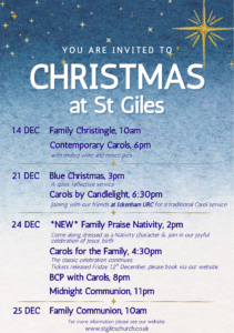 in St Giles’ Church and Church Hall on Friday 5 December 6-9pm and Saturday 6 December 11am-4pm. Have you considered entering our Christmas Tree Festival ?